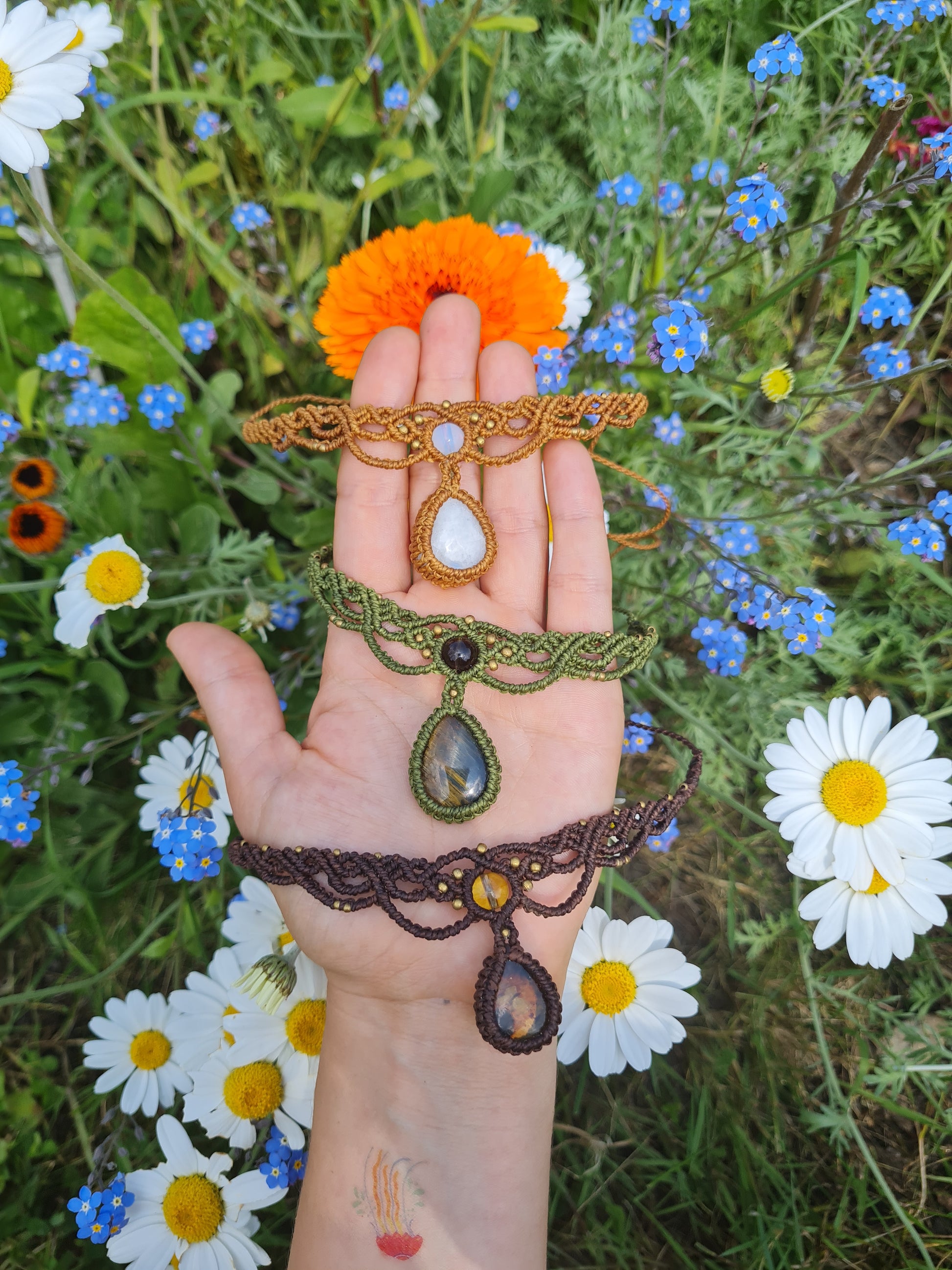 A set of three intricately handwoven macramé chokers, each carrying a distinct energy and symbolism.
