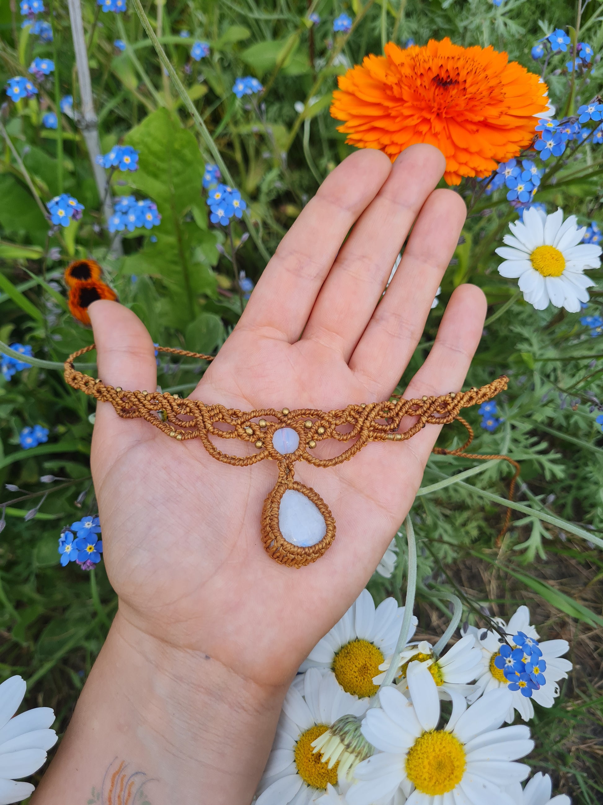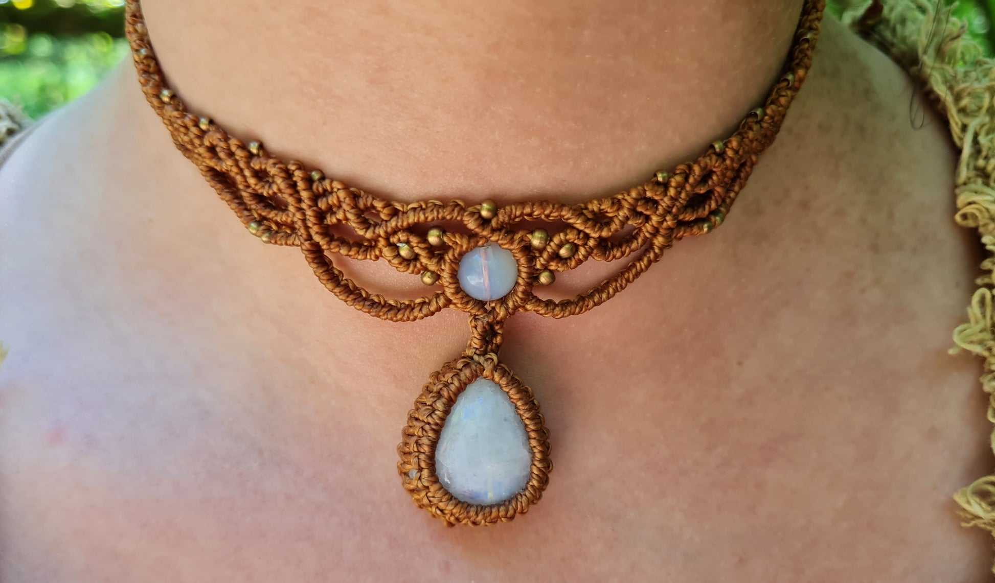 Lunar Whisper: The first choker, crafted in warm brown thread, features a luminous moonstone, glowing softly like a piece of the night sky. Its ethereal shimmer evokes intuition and feminine energy, accompanied by delicate white beads that enhance its celestial essence.