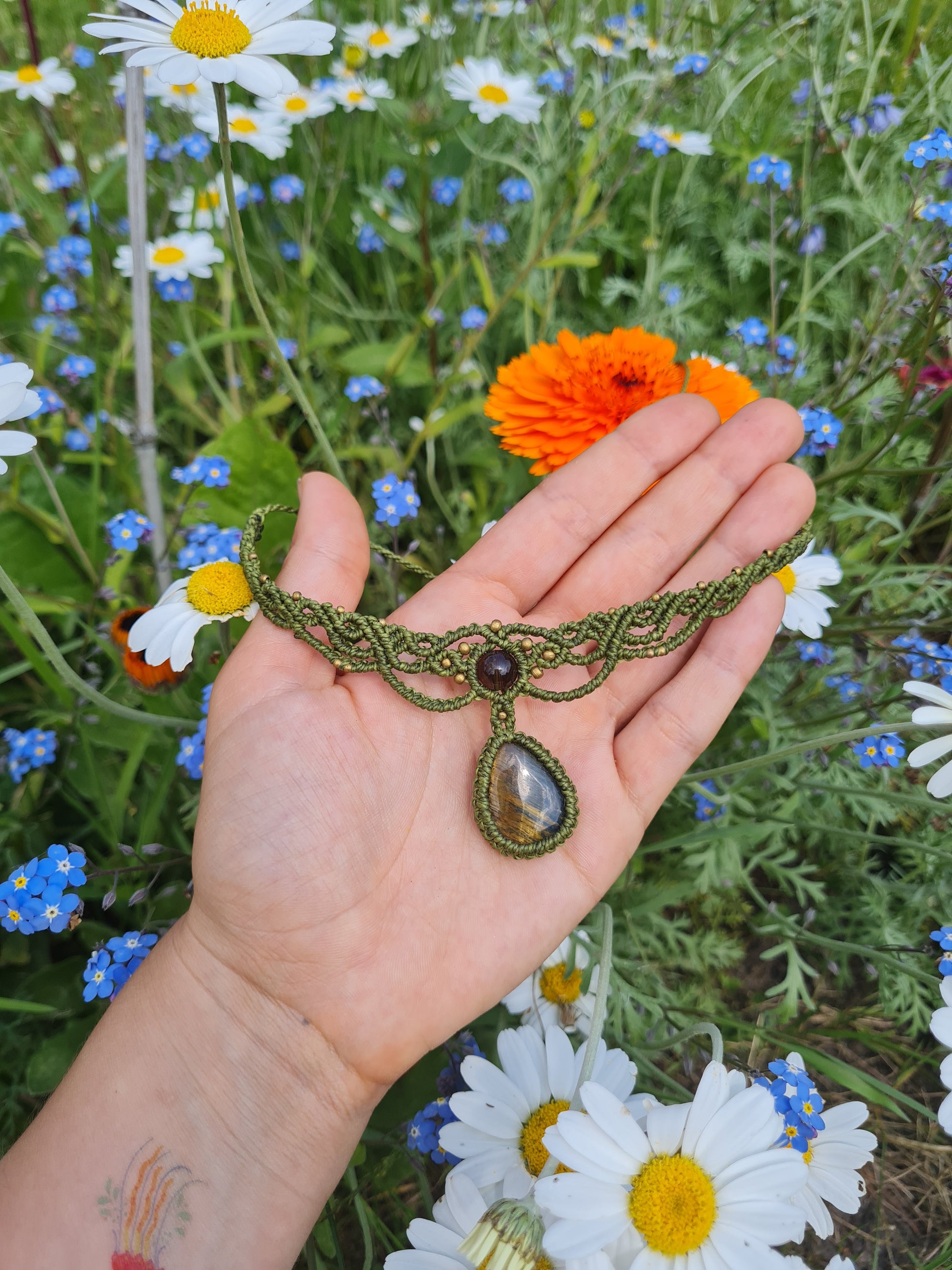 Hawk’s Vision: The second choker, woven in deep green macramé, cradles a falcon eye stone, its dark swirls reflecting quiet strength and perception. This piece resonates with the power of foresight and protection, its color mirroring the depths of the forest.